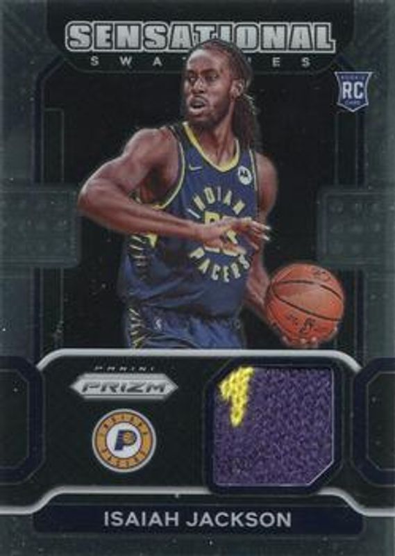The Isaiah Jackson 2021 Prizm #SW-IJA Sensational Swatches Rookie card is 1 of 97 Isaiah Jackson's card variations in the 2021 Prizm set being tracked by Sports Card Investor, including Base, Blue NBA 75th Anniversary, Blue Wave, Choice Blue Yellow Green, and Factory Set Blue Hyper.