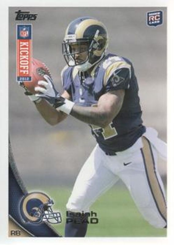 The Isaiah Pead 2012 Topps Kickoff #23 Base Rookie card is 1 of 2 Isaiah Pead's card variations in the 2012 Topps Kickoff set being tracked by Sports Card Investor, including Autographs /10.