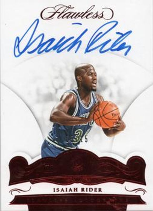 The Isaiah Rider 2017 Flawless #FA-IR Flawless Autographs - Ruby /15 card is 1 of 15 Isaiah Rider's card variations in the 2017 Flawless set being tracked by Sports Card Investor, including Excellence Signatures /25, Flawless Autographs /25, Premium Ink /25, Excellence Signatures - Ruby /15, and Premium Ink - Ruby /15.
