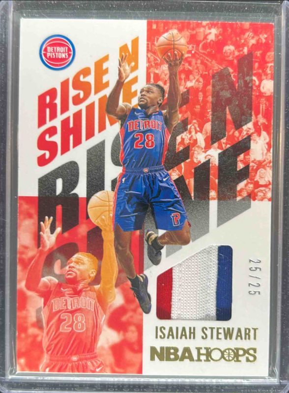 The Isaiah Stewart 2020 Hoops #RNS-IST Rise N' Shine Memorabilia - Prime /25 Rookie card is 1 of 43 Isaiah Stewart's card variations in the 2020 Hoops set being tracked by Sports Card Investor, including Base, Blue, Hyper Blue, Neon Green, and Purple.