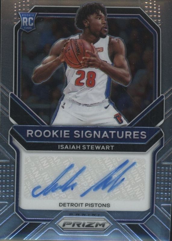 The Isaiah Stewart 2020 Prizm #RS-IST Rookie Signatures card in Raw condition has moved down -$8.72 (-58.1%) in the last 30 days and was last sold for $6.28 .