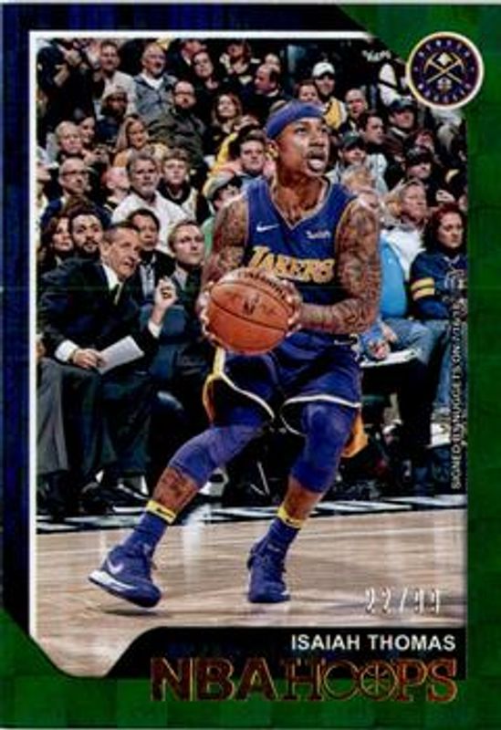 The Isaiah Thomas 2018 Hoops #195 Green /99 card is 1 of 20 Isaiah Thomas' card variations in the 2018 Hoops set being tracked by Sports Card Investor, including Base, Red Backs, Premium Box Set /199, Blue, and Purple.