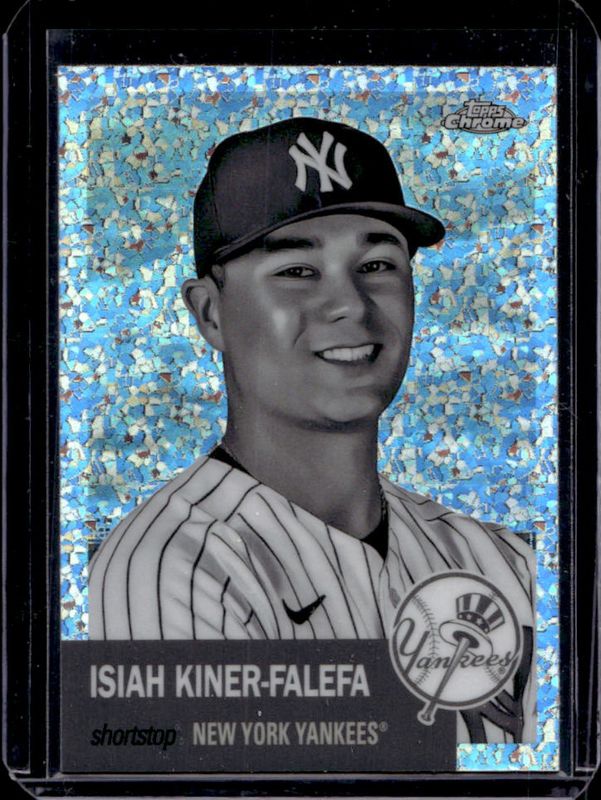 The Isiah Kiner-Falefa 2022 Topps Chrome Platinum Anniversary #182 Black & White Mini Diamond Refractor card is 1 of 34 Isiah Kiner-Falefa's card variations in the 2022 Topps Chrome Platinum Anniversary set being tracked by Sports Card Investor, including Base, Blue Prism Refractor, Gold Prism Refractor, Prism Refractor, and Red Prism Refractor.