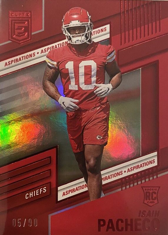 The Isiah Pacheco 2022 Elite #183 Aspirations (/90) Rookie card in Raw condition has not changed in price in the last 30 days and was last sold for $30.00 .