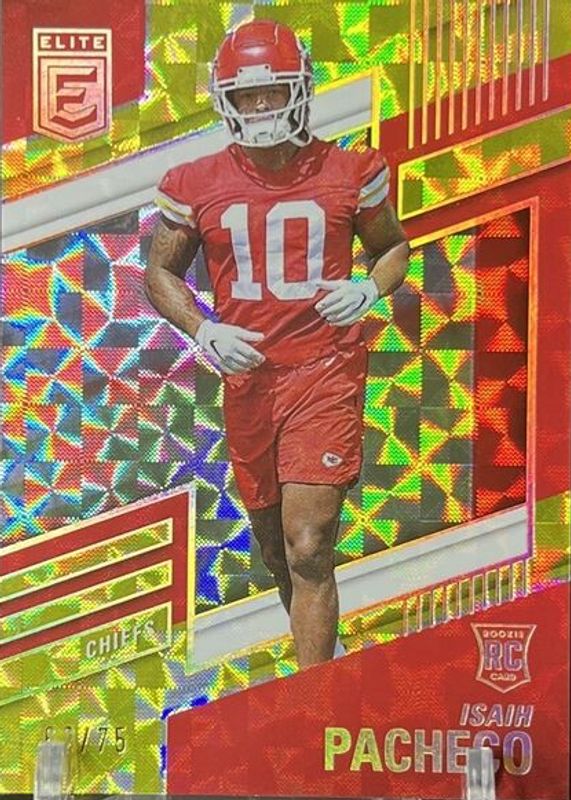 This card is 1 of 15 Isiah Pacheco's card variations in the 2022 Elite set being tracked by Sports Card Investor, including Base Rookie /999, Aspirations (/90), Green, Pink, and Status (/10).