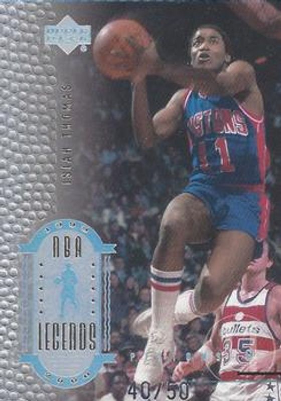 The Isiah Thomas 1999 Upper Deck Legends #45 Commemorative Collection /50 card is 1 of 8 Isiah Thomas' card variations in the 1999 Upper Deck Legends set being tracked by Sports Card Investor, including Base, Commemorative Collection Gold /1, Legendary Signatures, Recollections, and Legendary Jerseys /33.