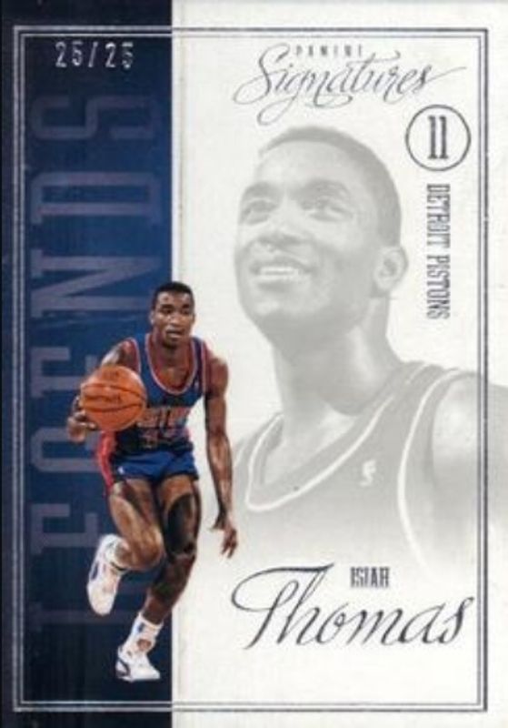 The Isiah Thomas 2012 Panini Signatures #117 Chase Legends /25 card is 1 of 30 Isiah Thomas' card variations in the 2012 Panini Signatures set being tracked by Sports Card Investor, including #111 Chase Legends /25, #112 Chase Legends /25, #113 Chase Legends /25, #114 Chase Legends /25, and #115 Chase Legends /25.