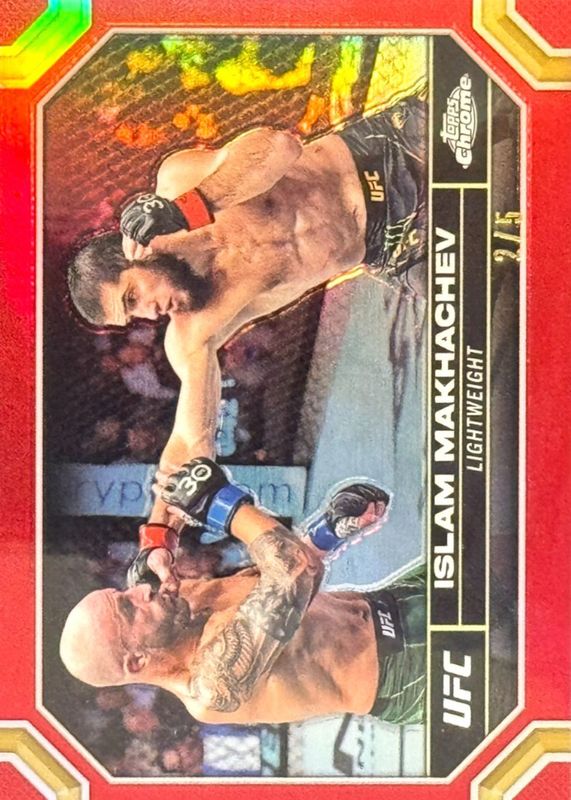 The Islam Makhachev 2024 Topps Chrome UFC #80 Red Refractor /5 card in Raw condition has not changed in price in the last 30 days and was last sold for $137.50 .