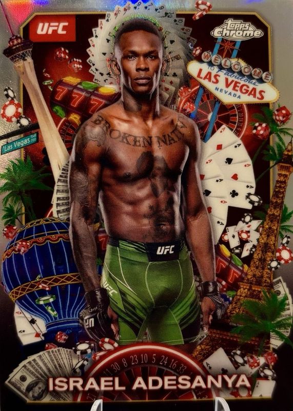Israel Adesanya's MMA cards are available in at least 25 sets. Israel Adesanya's biggest 7-day price movers are 2025 Topps Chrome UFC #TNS-11 Titans /(SSP), 2021 Select UFC #233 Octagonside Blue Disco /99, and 2024 Topps Chrome UFC #ATG-5 All the Glory.