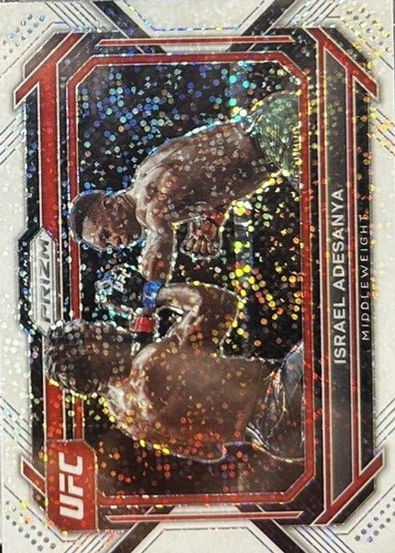 The Israel Adesanya 2023 Prizm UFC #82 White Sparkle /(SSP) card in Raw condition has not changed in price in the last 30 days and was last sold for $41.00 .