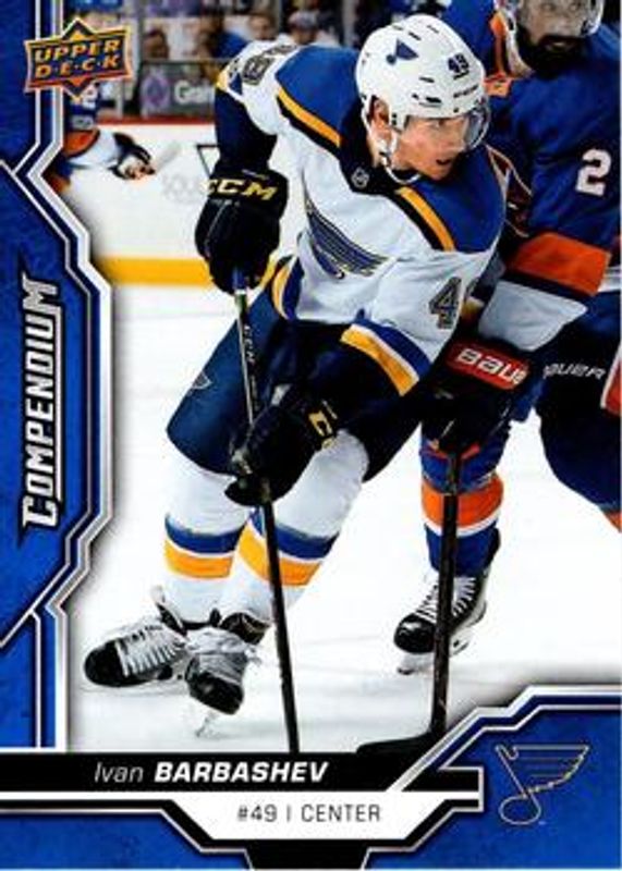 The Ivan Barbashev 2018 Upper Deck Compendium #337 Blue card is 1 of 6 Ivan Barbashev's card variations in the 2018 Upper Deck Compendium set being tracked by Sports Card Investor, including Gold, Printing Plates Black /1, Printing Plates Cyan /1, Printing Plates Magenta /1, and Printing Plates Yellow /1.