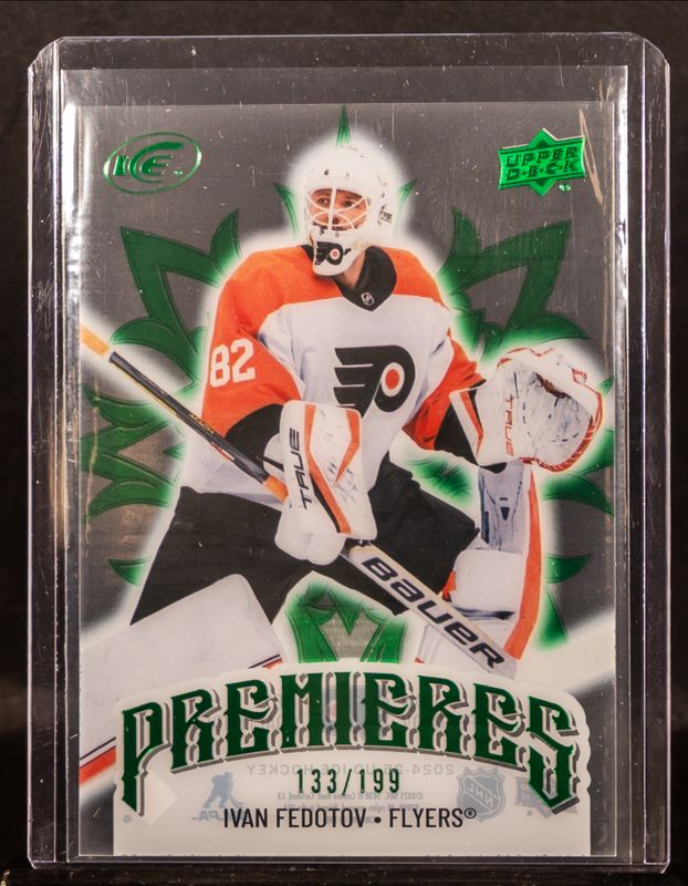 The Ivan Fedotov 2024 Upper Deck Ice #157 Emerald Green /199 Rookie card is 1 of 18 Ivan Fedotov's card variations in the 2024 Upper Deck Ice set being tracked by Sports Card Investor, including #138 Base /799, #157 Base /799, #138 Jersey, #138 Purple, and #138 White Snowflake Autographs.