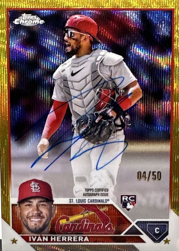 The Ivan Herrera 2023 Topps Chrome #RA-IH Rookie Autographs - Gold Wave Refractor /50 card in Raw condition has not changed in price in the last 30 days and was last sold for $107.50 .