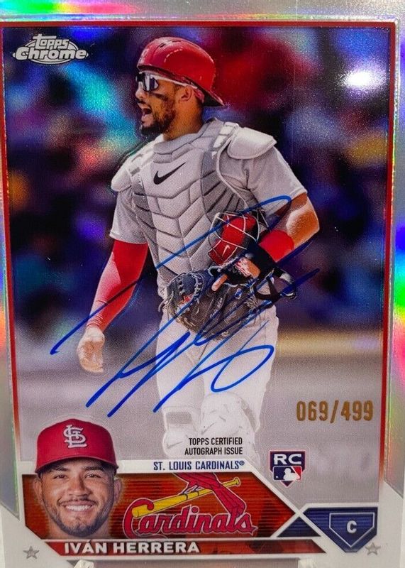 The Ivan Herrera 2023 Topps Chrome #RA-IH Rookie Autographs - Refractor /499 card in Raw condition has moved down -$10.01 (-22.2%) in the last 30 days and was last sold for $34.99 .