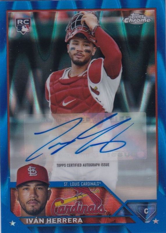 The Ivan Herrera 2023 Topps Chrome Update #AC-IH Autographs - Blue RayWave Refractor /150 Rookie card in Raw condition has not changed in price in the last 30 days and was last sold for $55.00 .