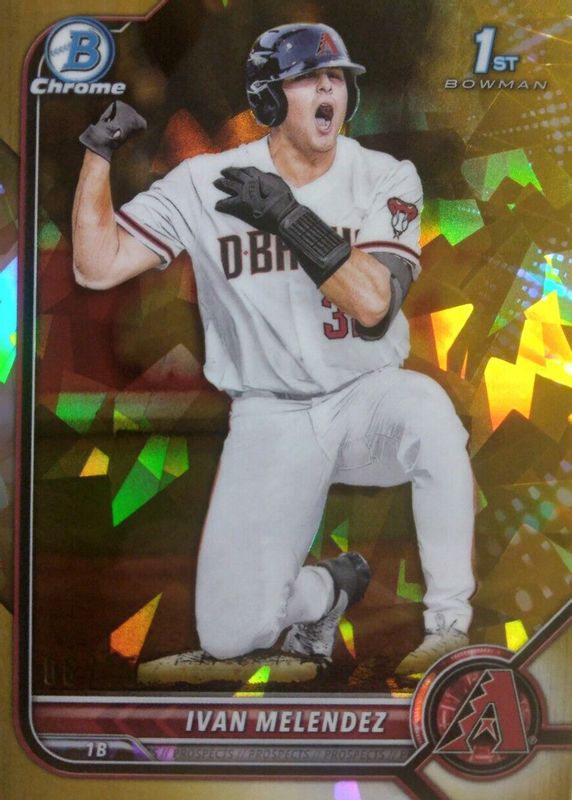 The Ivan Melendez 2022 Bowman Draft Sapphire Edition #BDC-29 Chrome - Gold /15 (1st) card in Raw condition has not changed in price in the last 30 days and was last sold for $21.01 .