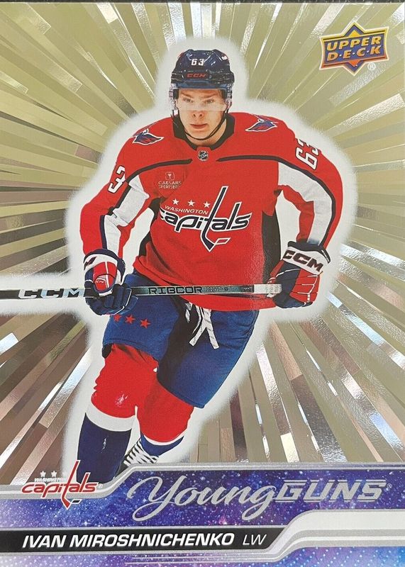 This card is 1 of 8 Ivan Miroshnichenko's card variations in the 2023 Upper Deck Extended Series set being tracked by Sports Card Investor, including Young Guns Base, Young Guns - Clear Cut, Young Guns - Deluxe /250, Young Guns - UD Exclusives /100, and Young Guns - Outburst Red /25.
