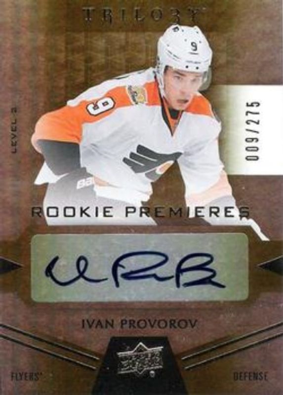 The Ivan Provorov 2016 Upper Deck Trilogy #91 Base /275 Rookie card is 1 of 9 Ivan Provorov's card variations in the 2016 Upper Deck Trilogy set being tracked by Sports Card Investor, including #124 Base /275, #58 Base /275, #91 Green Rainbow Foil /352, #124 Green Rainbow Foil /352, and #58 Green Rainbow Foil /352.