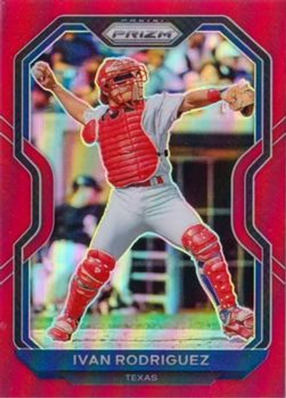 The Ivan Rodriguez 2021 Prizm #2 Red card is 1 of 43 Ivan Rodriguez's card variations in the 2021 Prizm set being tracked by Sports Card Investor, including Base, Blue, Blue Velocity, Carolina Blue, and Cosmic Haze.