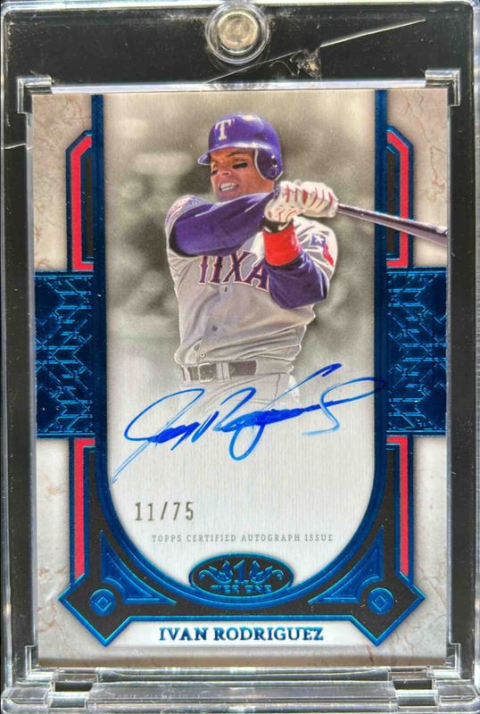 The Ivan Rodriguez 2024 Topps Tier One #PPA-IR Prime Performers Autographs - Blue Foil /99 card is 1 of 21 Ivan Rodriguez's card variations in the 2024 Topps Tier One set being tracked by Sports Card Investor, including Autographed Tier One Relics Jumbo /99, Autographed Tier One Relics Jumbo - Blue /99, Prime Performers Autographs /99, Tier One Autographs /49, and Tier One Autographs - Green Foil /30.