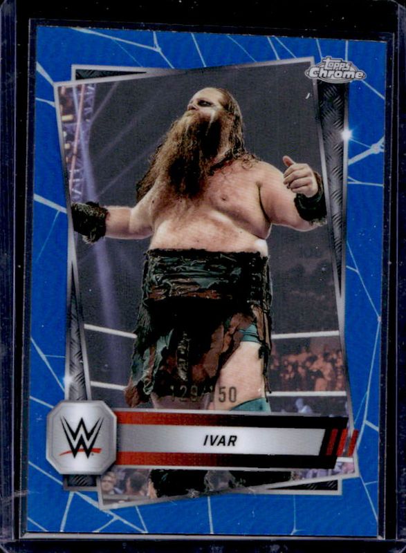 The Ivar 2025 Topps Chrome WWE #77 Blue Refractor /150 card is 1 of 46 Ivar's card variations in the 2025 Topps Chrome WWE set being tracked by Sports Card Investor, including Geometric Refractor, Neon Green & Black Refractor, Pink Shimmer Refractor, Prism Refractor, and Purple Refractor.