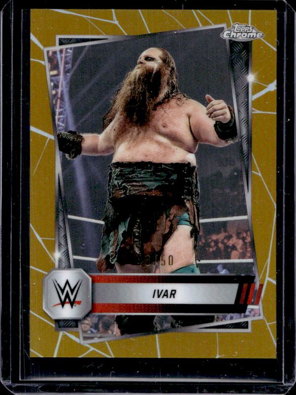 The Ivar 2025 Topps Chrome WWE #77 Gold Refractor /50 card is 1 of 46 Ivar's card variations in the 2025 Topps Chrome WWE set being tracked by Sports Card Investor, including Geometric Refractor, Neon Green & Black Refractor, Pink Shimmer Refractor, Prism Refractor, and Purple Refractor.