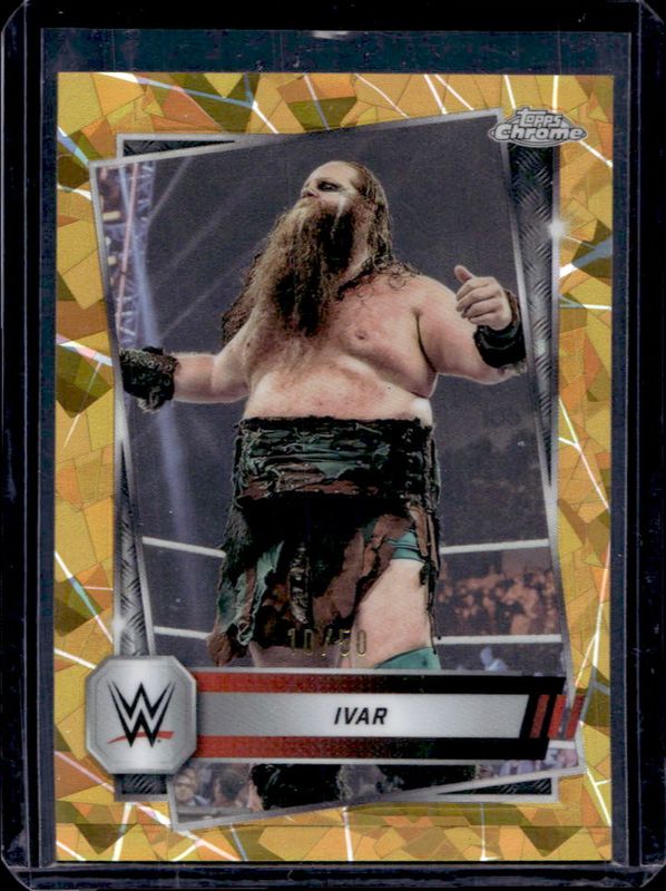 The Ivar 2025 Topps Chrome WWE Sapphire Edition #77 Base Chrome - Gold Refractor /50 card is 1 of 10 Ivar's card variations in the 2025 Topps Chrome WWE Sapphire Edition set being tracked by Sports Card Investor, including Red Brand Autographs, Base Chrome - Green Refractor /75, Base Chrome - Orange Refractor /25, Red Brand Autographs - Orange Refractor /25, and Base Chrome - Purple Refractor /10.