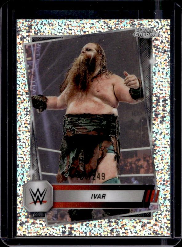 The Ivar 2025 Topps Chrome WWE #77 Speckle Refractor /249 card is 1 of 46 Ivar's card variations in the 2025 Topps Chrome WWE set being tracked by Sports Card Investor, including Geometric Refractor, Neon Green & Black Refractor, Pink Shimmer Refractor, Prism Refractor, and Purple Refractor.