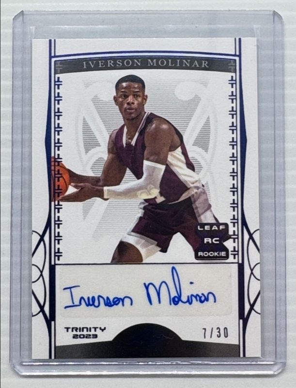 The Iverson Molinar 2022 Leaf Trinity #BA-IM1 Blue /30 card is 1 of 17 Iverson Molinar's card variations in the 2022 Leaf Trinity set being tracked by Sports Card Investor, including Base /49, Gold /35, Holo Platinum /25, Holo Green /20, and Holo Silver /15.