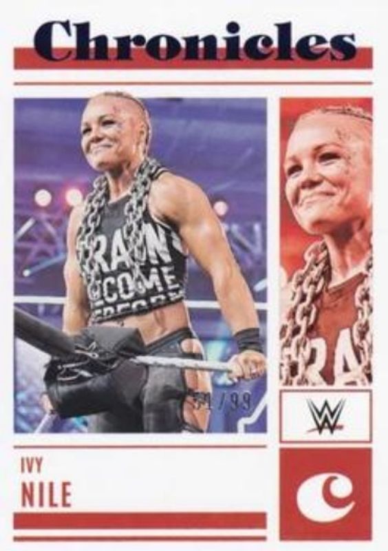 The Ivy Nile 2023 Chronicles WWE #48 Blue /99 card is 1 of 13 Ivy Nile's card variations in the 2023 Chronicles WWE set being tracked by Sports Card Investor, including Base, Bronze, Pink /199, Red /199, and Green /75.
