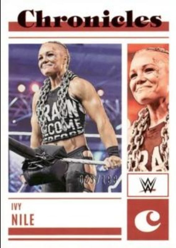 The Ivy Nile 2023 Chronicles WWE #48 Red /199 card is 1 of 13 Ivy Nile's card variations in the 2023 Chronicles WWE set being tracked by Sports Card Investor, including Base, Bronze, Pink /199, Blue /99, and Green /75.