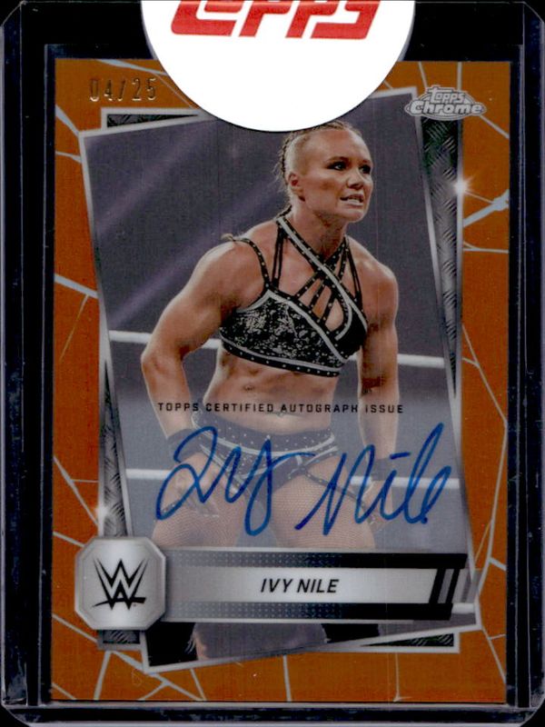 The Ivy Nile 2025 Topps Chrome WWE #CLA-VY Autographs - Orange Refractor /25 card is 1 of 61 Ivy Nile's card variations in the 2025 Topps Chrome WWE set being tracked by Sports Card Investor, including Base, Black & Gold Refractor, Geometric Refractor, Neon Green & Black Refractor, and Pink Shimmer Refractor.