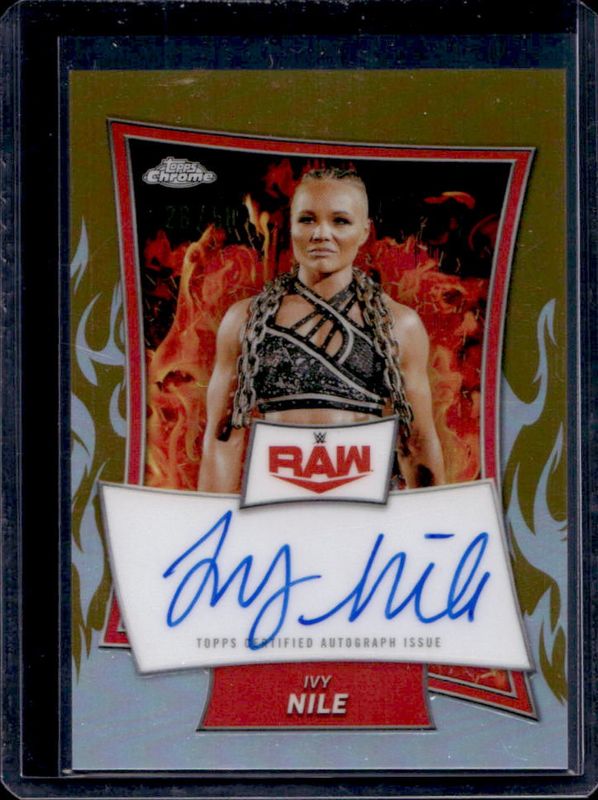 The Ivy Nile 2025 Topps Chrome WWE #RBA-IVY Red Brand Autographs - Gold Refractor /50 card is 1 of 61 Ivy Nile's card variations in the 2025 Topps Chrome WWE set being tracked by Sports Card Investor, including Base, Black & Gold Refractor, Geometric Refractor, Neon Green & Black Refractor, and Pink Shimmer Refractor.