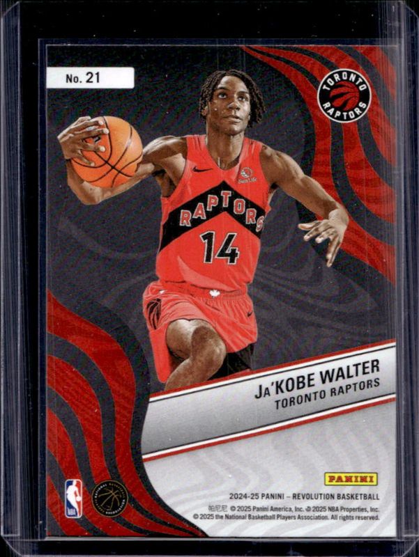 The Ja'Kobe Walter 2024 Revolution #21 New Wave Rookie card is 1 of 67 Ja'Kobe Walter's card variations in the 2024 Revolution set being tracked by Sports Card Investor, including Base, Astro, Blue Storm, Chinese New Year, and Fractal.