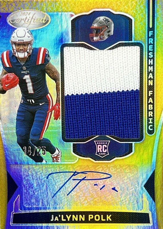 The Ja'Lynn Polk 2024 Certified #FMS-JPK Freshman Fabric Signatures - Mirror Gold /25 Rookie card in Raw condition has not changed in price in the last 30 days and was last sold for $6.25 .