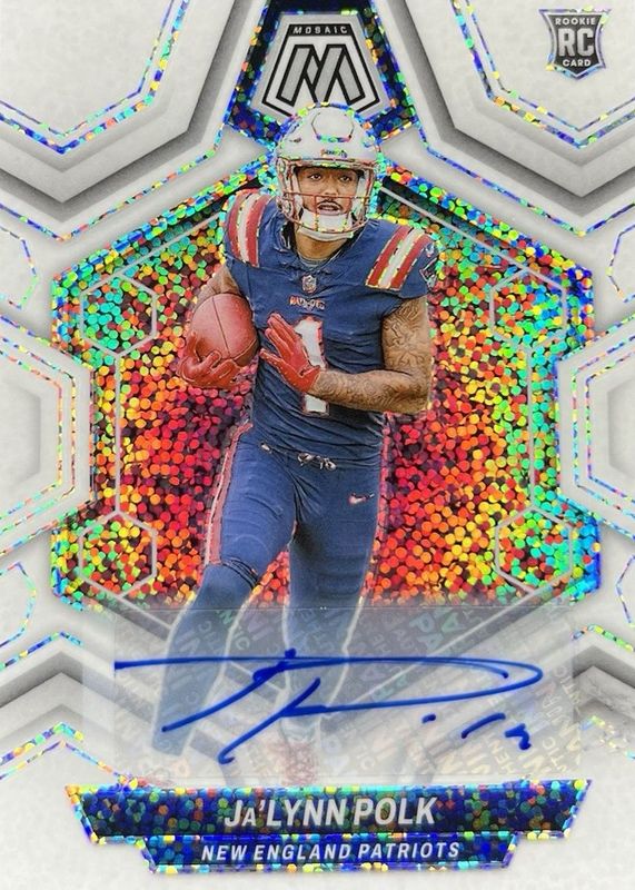This card is 1 of 61 Ja'Lynn Polk's card variations in the 2024 Mosaic set being tracked by Sports Card Investor, including Base, Green, Mosaic, No Huddle, and Pink Camo.