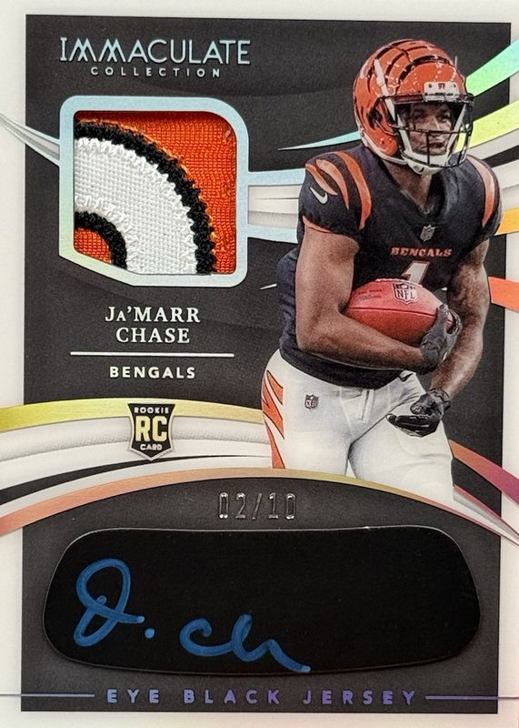 This card is 1 of 26 Ja'Marr Chase's card variations in the 2021 Immaculate set being tracked by Sports Card Investor, including Immaculate Introductions Autographs (/49), Immaculate Numbers Rookie Patch Autographs (/1), Immaculate Rookie Eye Black Jersey Autographs (/99), Immaculate Rookie Eye Black Jersey Autographs - Gold (/25), and Immaculate Rookie Shadowbox Signatures (/75).