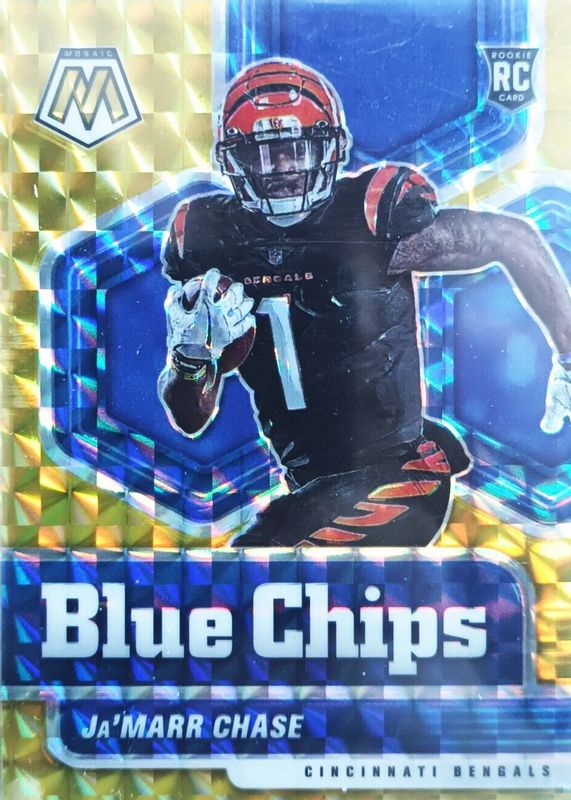 The Ja'Marr Chase 2021 Mosaic #7 Blue Chips - Gold /10 Rookie card in Raw condition has not changed in price in the last 30 days and was last sold for $135.00 .