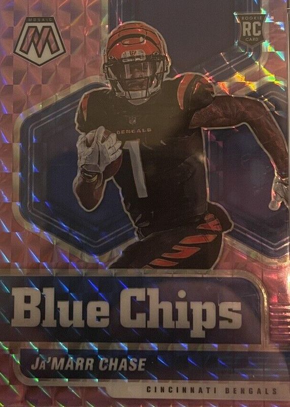 The Ja'Marr Chase 2021 Mosaic #7 Blue Chips - Purple /49 Rookie card in Raw condition has not changed in price in the last 30 days and was last sold for $25.99 .