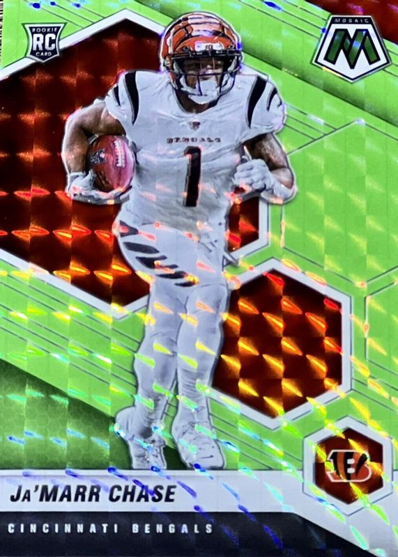 The Ja'Marr Chase 2021 Mosaic #307 Green Fluorescent /10 Rookie card in Raw condition has not changed in price in the last 30 days and was last sold for $443.00 .