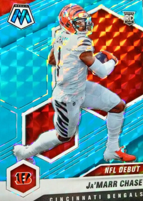 The Ja'Marr Chase 2021 Mosaic #247 NFL Debut - Blue Fluorescent /15 Rookie card in Raw condition has not changed in price in the last 30 days and was last sold for $215.00 .