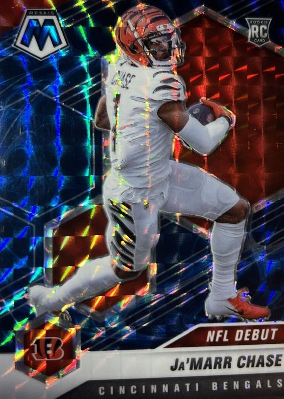 The Ja'Marr Chase 2021 Mosaic #247 NFL Debut - Genesis /(SSP) Rookie card in Raw condition has not changed in price in the last 30 days and was last sold for $76.00 .