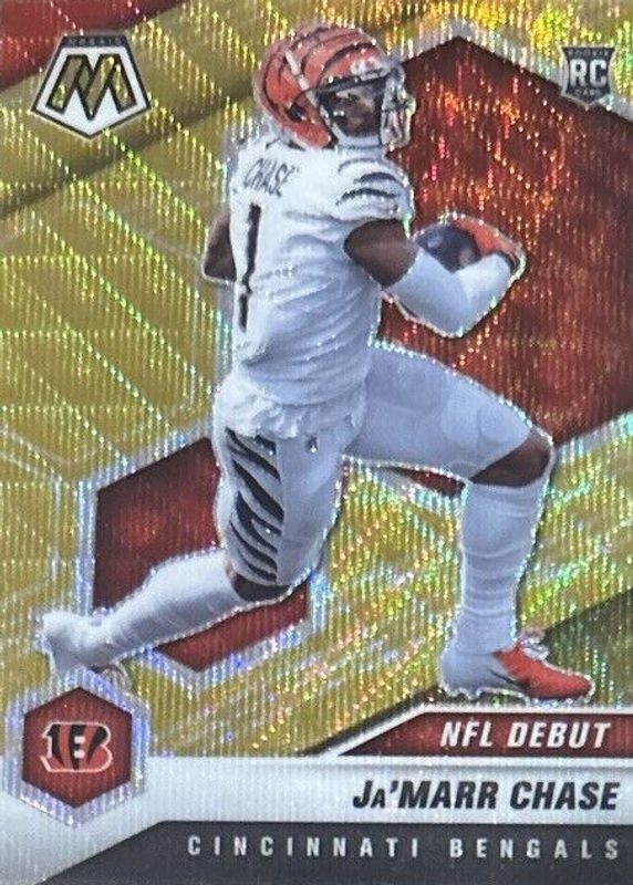 The Ja'Marr Chase 2021 Mosaic #247 NFL Debut - Gold Wave /17 Rookie card in Raw condition has not changed in price in the last 30 days and was last sold for $123.05 .