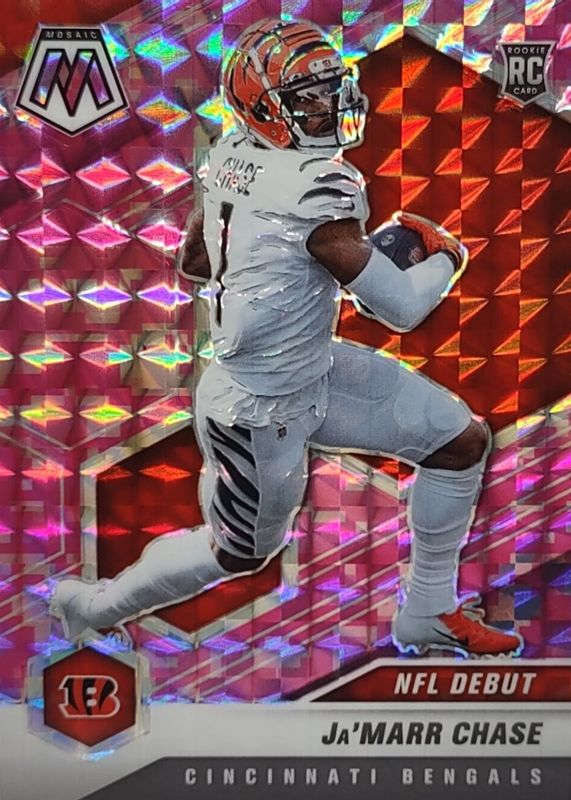 The Ja'Marr Chase 2021 Mosaic #247 NFL Debut - Pink Camo Rookie card in Raw condition has moved up $0.38 (+4.5%) in the last 30 days and was last sold for $8.88 .