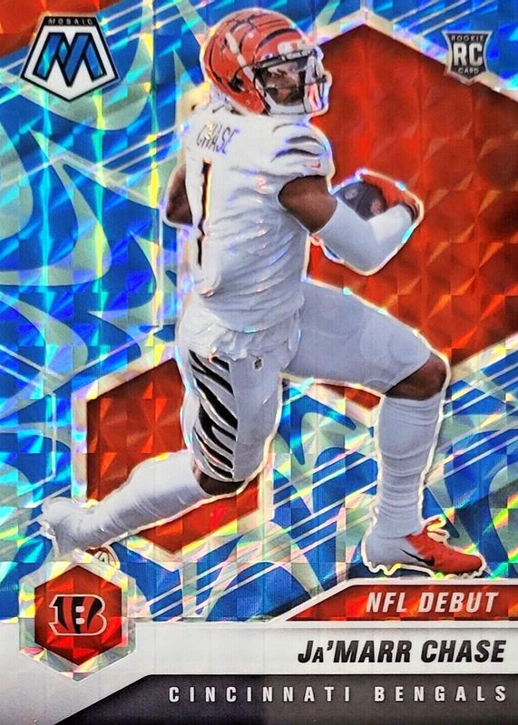 The Ja'Marr Chase 2021 Mosaic #247 NFL Debut - Reactive Blue Rookie card in Raw condition has not changed in price in the last 30 days and was last sold for $11.50 .