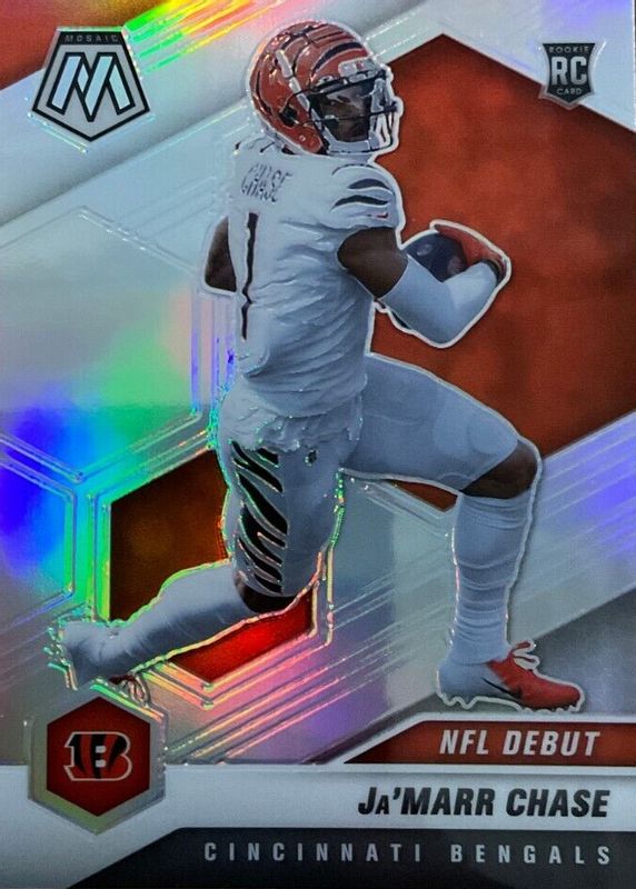 The Ja'Marr Chase 2021 Mosaic #247 NFL Debut - Silver Rookie card in Raw condition has moved down -$9.01 (-90.1%) in the last 30 days and was last sold for $0.99 .