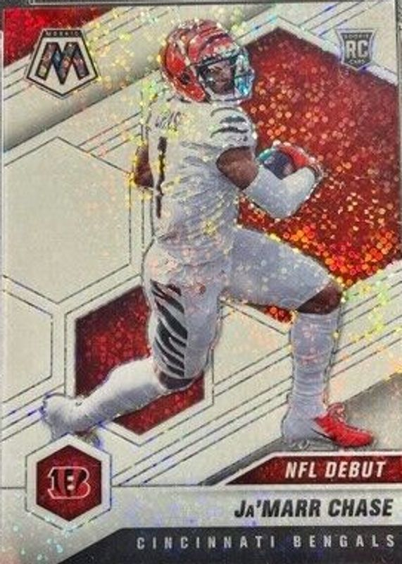 The Ja'Marr Chase 2021 Mosaic #247 NFL Debut - White Sparkle /(SSP) Rookie card in Raw condition has not changed in price in the last 30 days and was last sold for $172.19 .