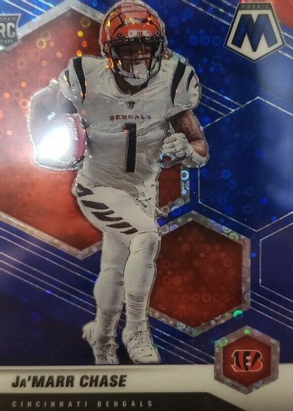 The Ja'Marr Chase 2021 Mosaic #307 No Huddle Blue /75 Rookie card in Raw condition has not changed in price in the last 30 days and was last sold for $34.00 .