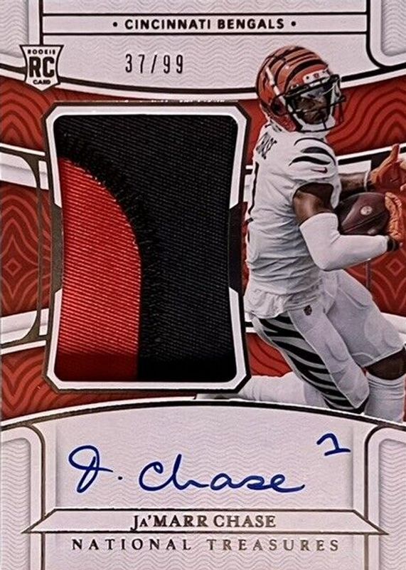 The Ja'Marr Chase 2021 National Treasures #162 Rookie Patch Auto /99 card in Raw condition has not changed in price in the last 30 days and was last sold for $1,713.00 .