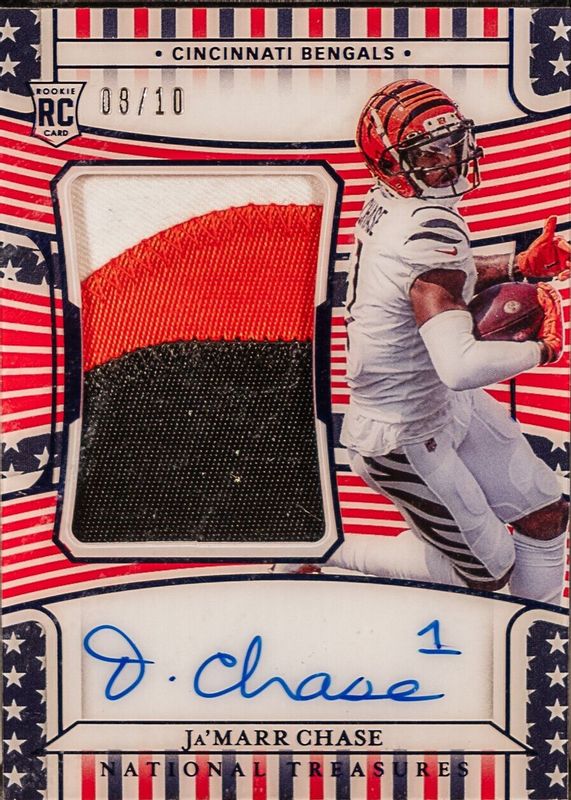 The Ja'Marr Chase 2021 National Treasures #162 Rookie Patch Auto - Stars & Stripes Blue /10 card in Raw condition has not changed in price in the last 30 days and was last sold for $2,376.00 .